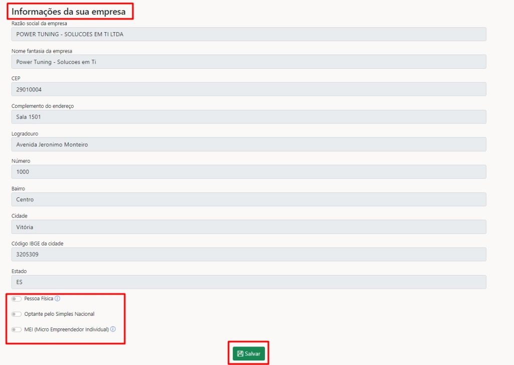 Após digitar/alterar o CNPJ, o sistema vai preencher todos os dados da sua empresa, como a razão social, nome fantasia, endereço, conforme a imagem abaixo: