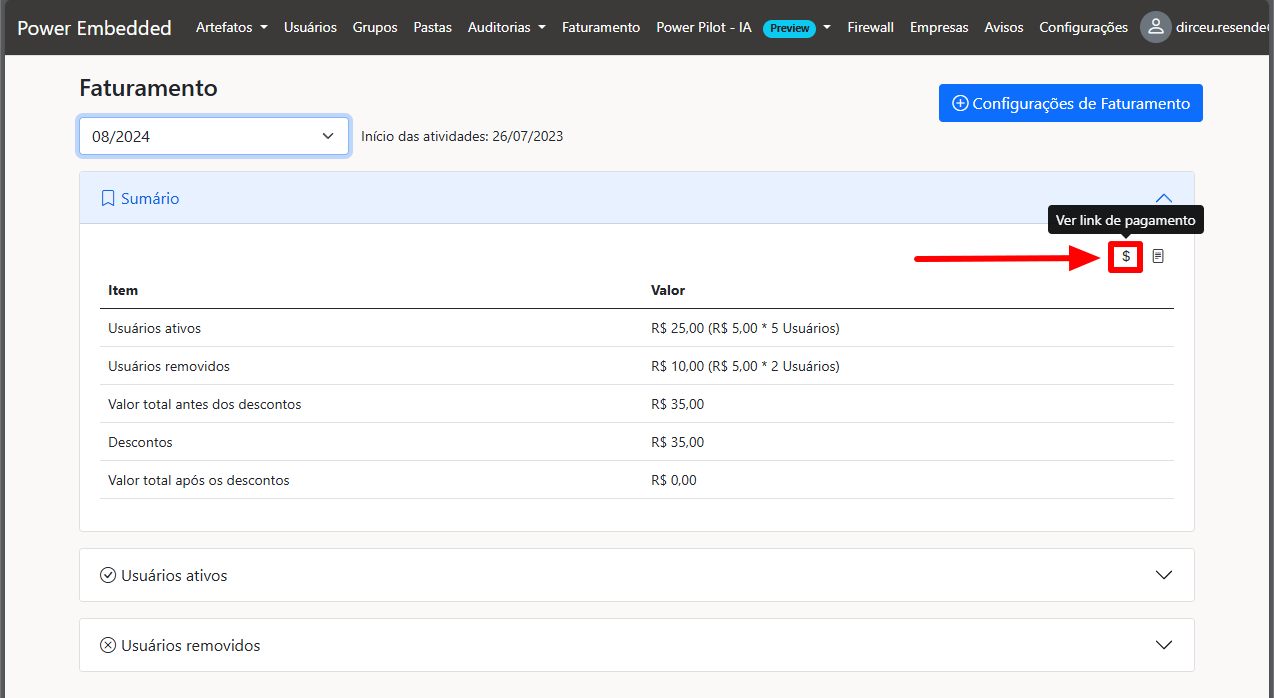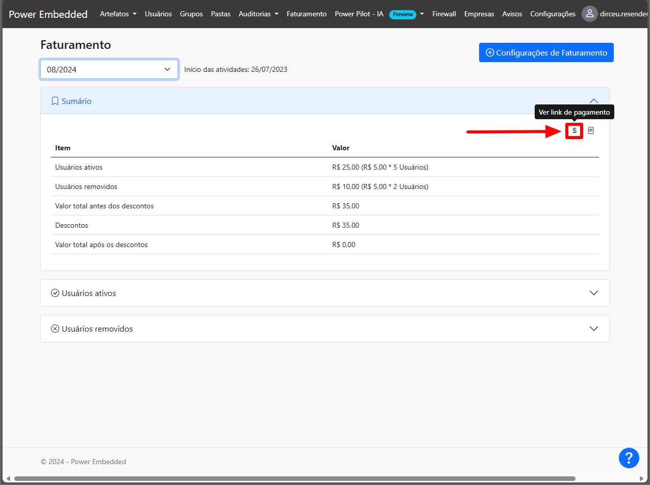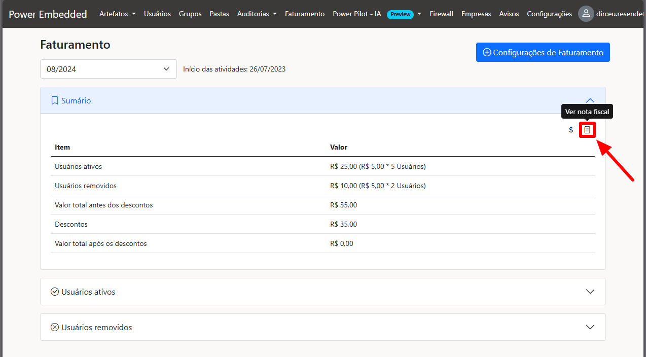 Acesse sua nota fiscal e link de pagamento do Power Embedded