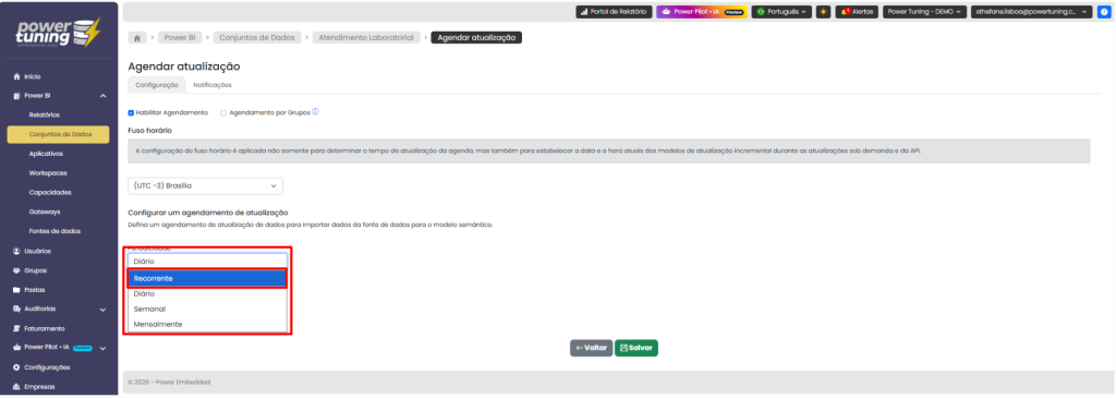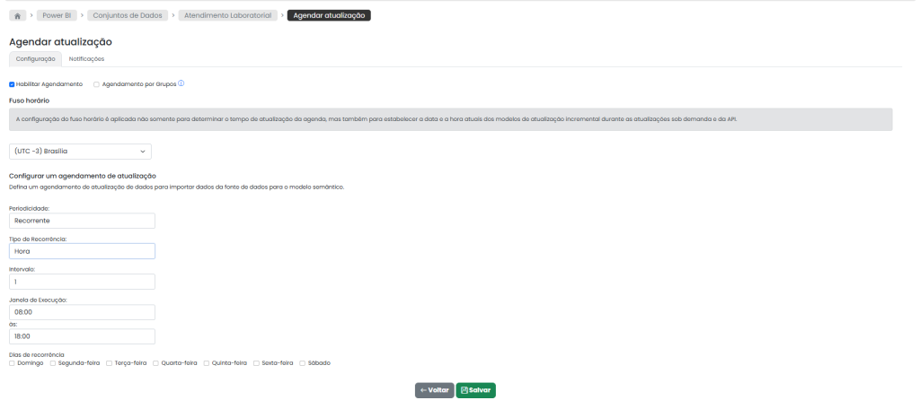 O agendamento recorrente permite definiar atualizações automáticas com base em intervalo de tempo, período do dia e dias da semana.