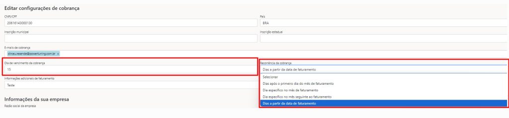 - Dias a partir da data de faturamento: Número de dias que serão contados a partir da data em que a fatura é gerada. Por exemplo, se você configurar 15 dias, a data de vencimento será 15 dias a partir do dia que o faturamento foi realizado, que geralmente ocorre nos primeiros 5 dias úteis do mês. Valores válidos: Entre 1 e 90 dias.