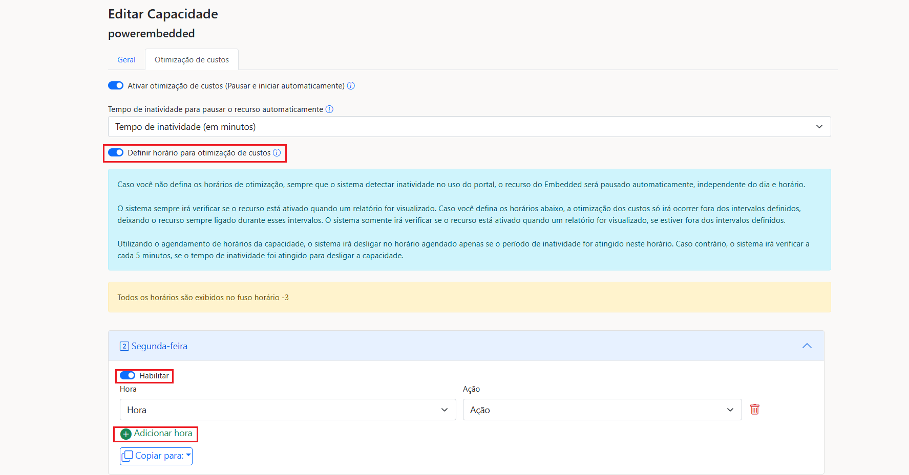 Configurando a otimização de custos por horário.
