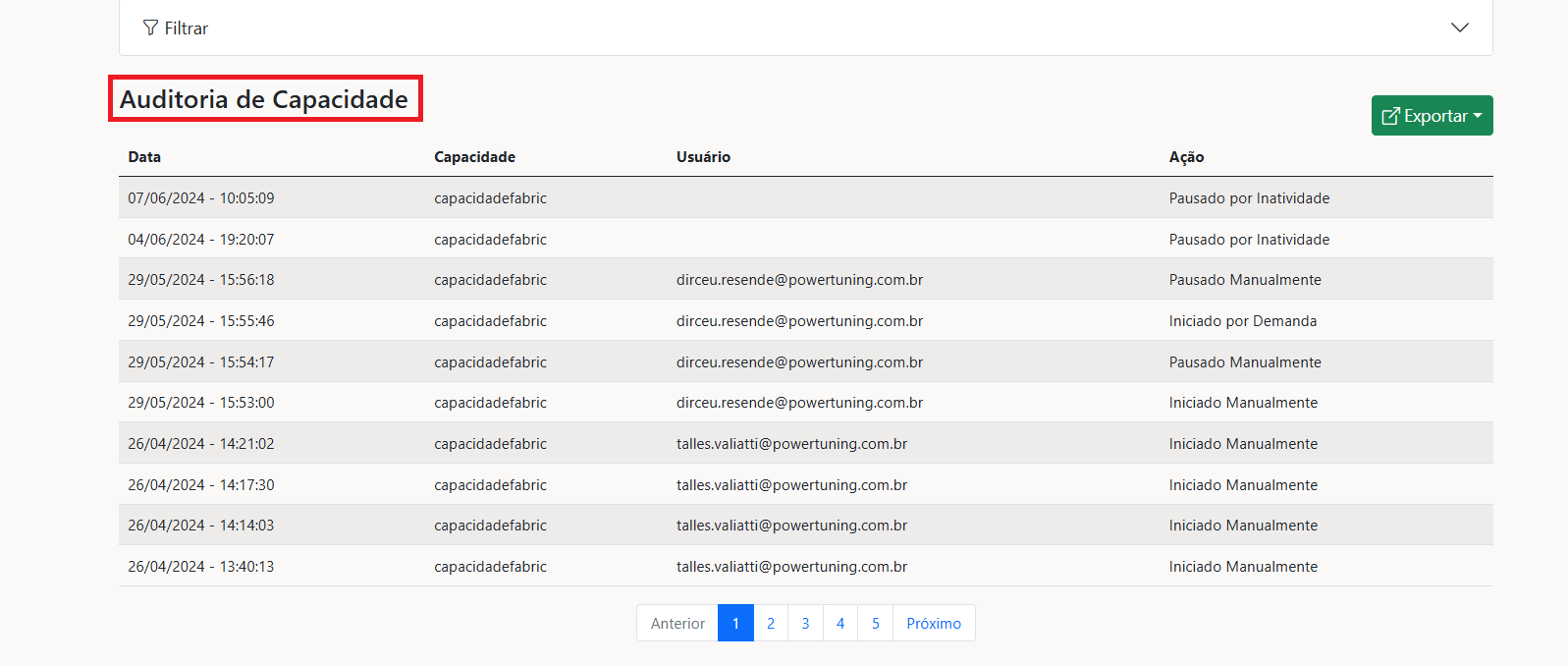 Para uma análise mais detalhada das informações da capacidade, a auditoria oferece uma visão do seu comportamento. Aqui, é possível acompanhar quando ela foi ligada/desligada, a data e hora da ação, e também o responsável, caso a ativação/desativação não seja automática. Clique para saber mais.