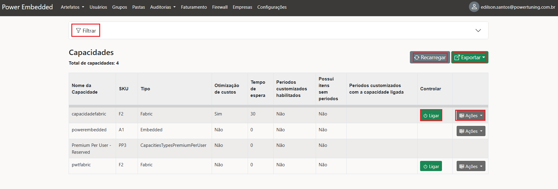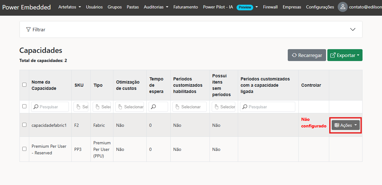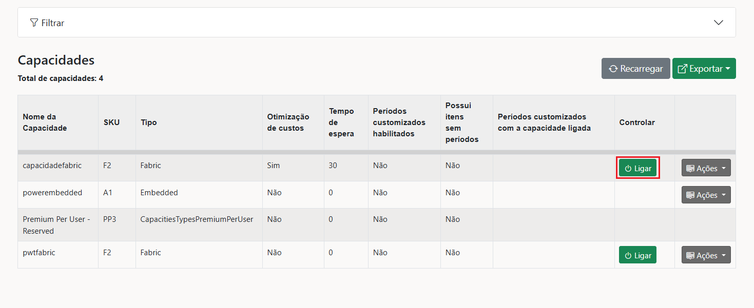Observação: É importante ressaltar que quando uma capacidade está desligada, o usuário não consegue visualizar o relatório e o conjunto de dados não é atualizado. Portanto, é crucial planejar o horário de uso para evitar possíveis falhas no ambiente.