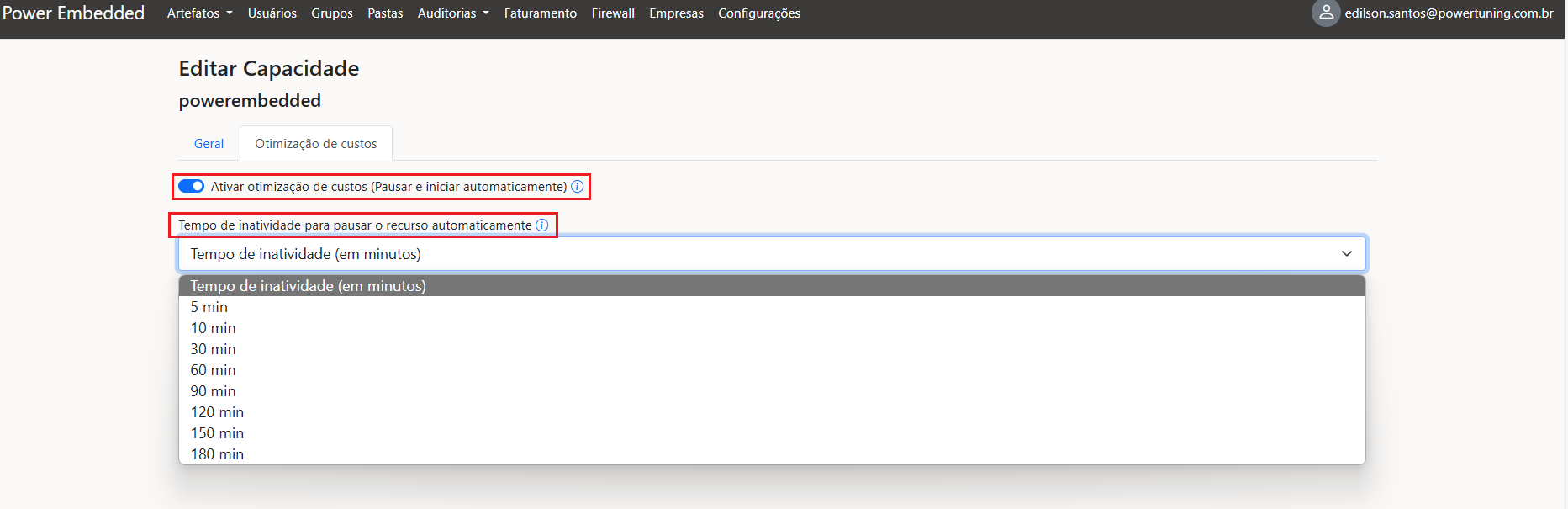 - Você pode definir o período de minutos durante o qual sua capacidade pode permanecer inativa (ou seja, sem relatórios abertos). Quando o sistema detecta que nenhum relatório foi acessado durante esse período, a capacidade é automaticamente pausada.