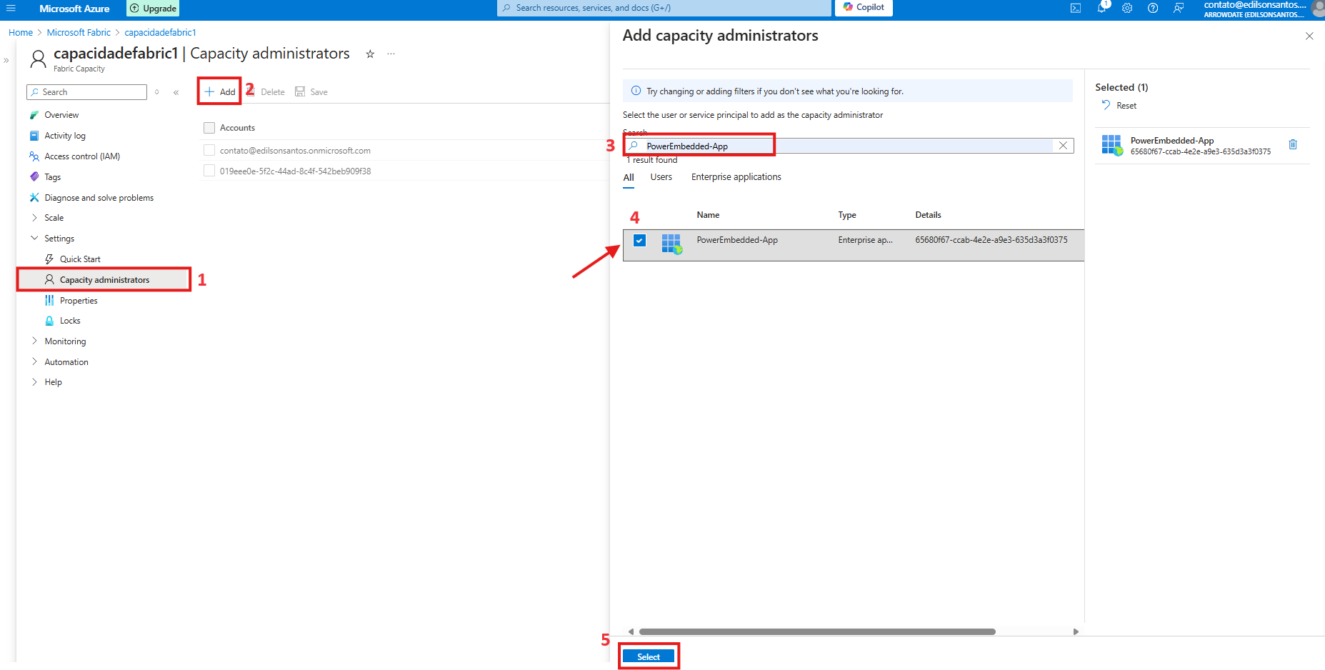 Nessa tela vá em Settings > Capacity administrators e clique em Add, ao abrir a tela pesquise por PowerEmbedded-App e clique em Select.
