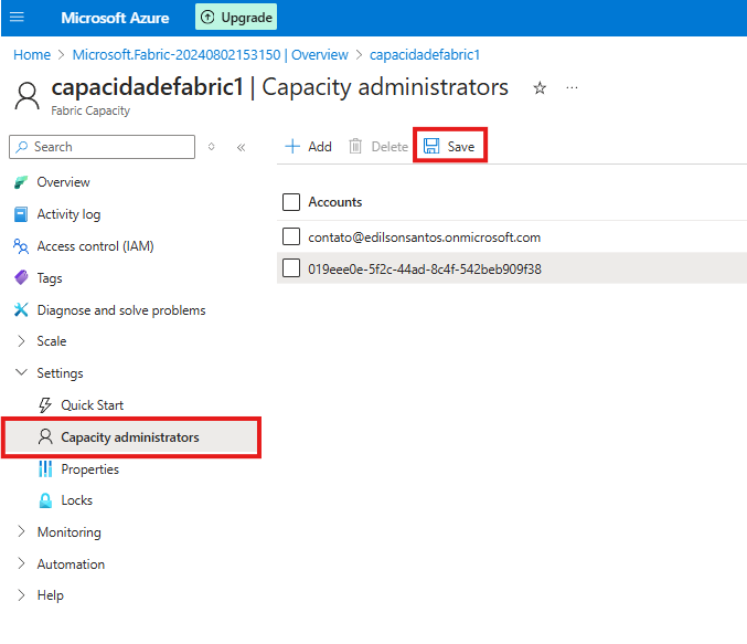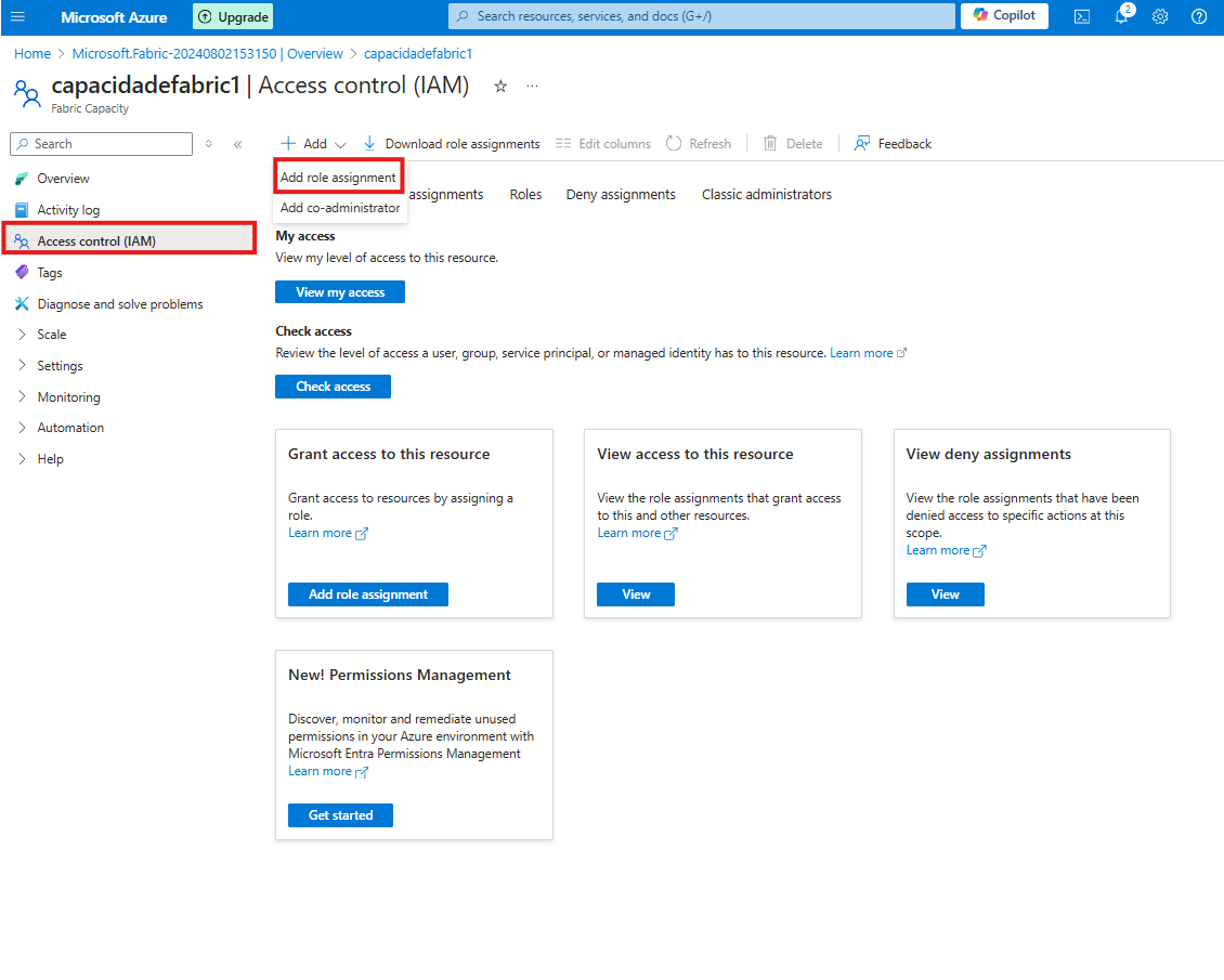 Nesta aba, você pode adicionar as pessoas que terão permissão para atribuir um workspace à capacidade.