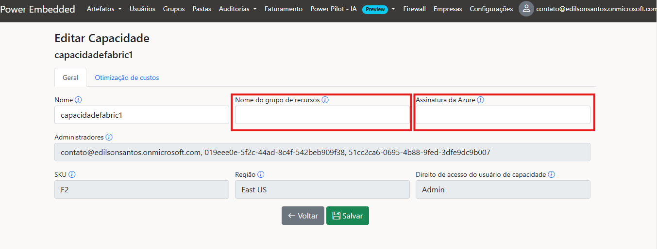 Para obter esses valores, acesse o portal da Azure e localize o recurso contratado. Na seção ‘Overview’ ou ‘Visão Geral’, você encontrará as informações necessárias. Copie o ‘Nome do grupo de recursos’ e o ‘ID da assinatura da Azure’ e cole essas informações no portal do Power Embedded e salve.