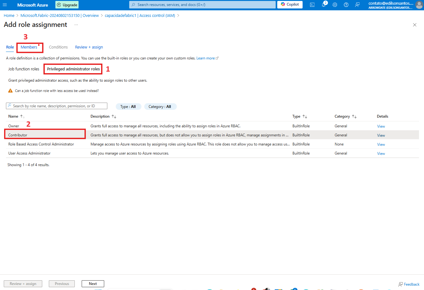 Nessa nova tela clique em Priveleged admnistrator roles > Contributor > Members