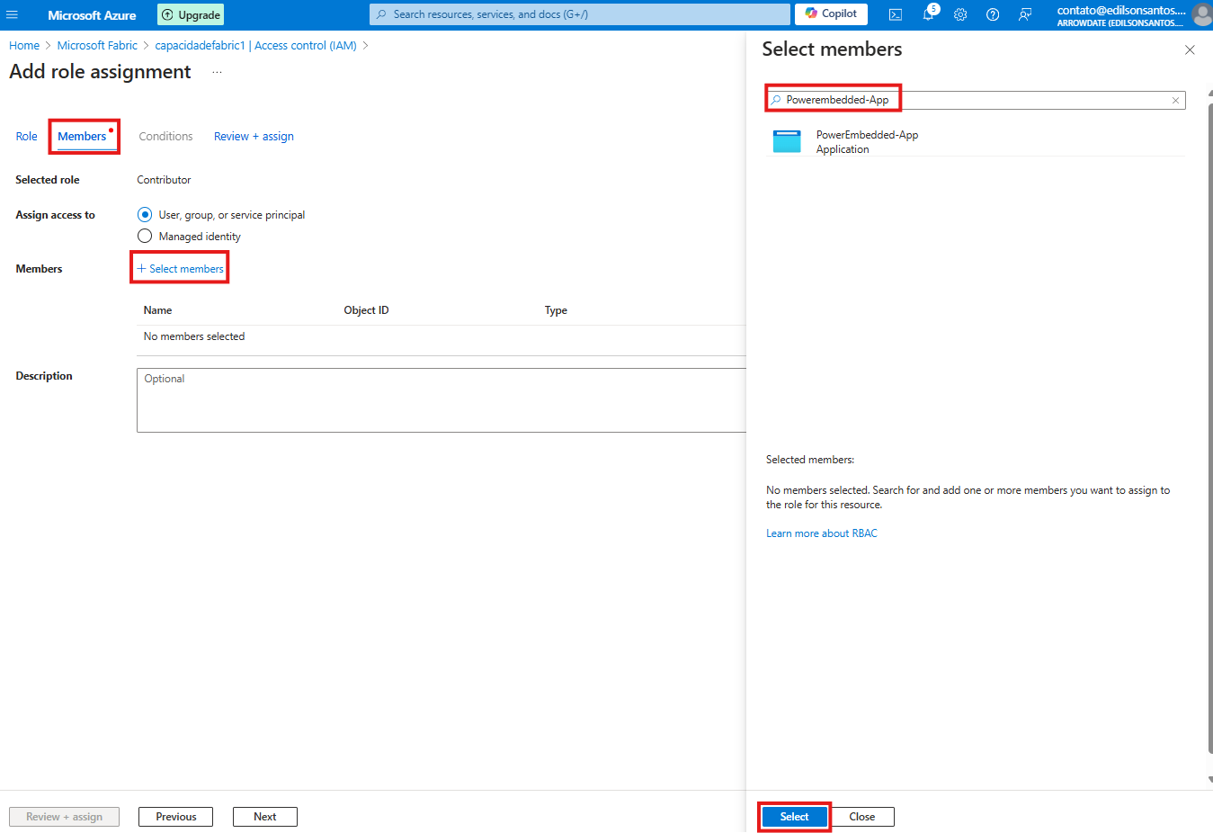 Na tela de membros clique em Select members para buscar pelo usuário PowerEmbedded-App e seleciona-lo.