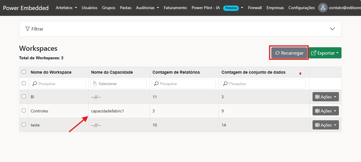 Atenção: Após concluir o processo, é importante verificar no portal do Power Embedded em Workspaces > Recarregar para confirmar se a associação foi identificada. Para que a otimização de custos seja aplicada corretamente, o nome da capacidade deve aparecer no campo, conforme mostrado na imagem abaixo.