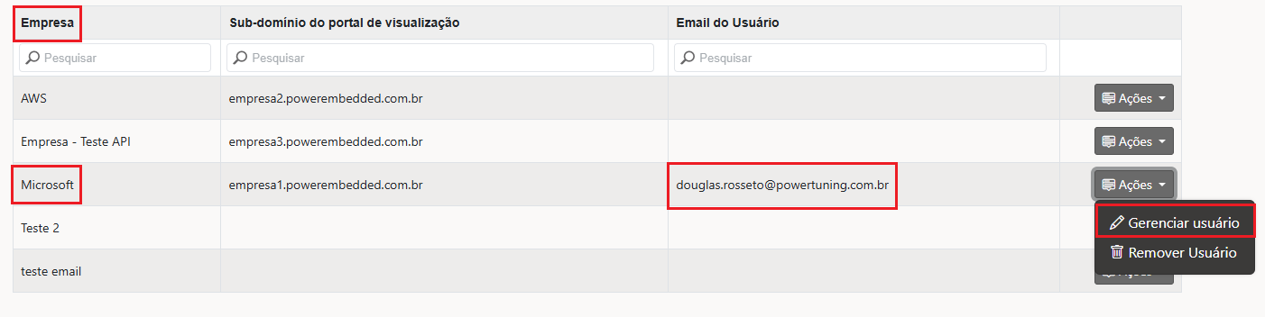 Agora você irá clicar nas 3 elipses (…) ao lado do gateway que deseja liberar a permissão e selecionar a opção Gerenciar Usuários.