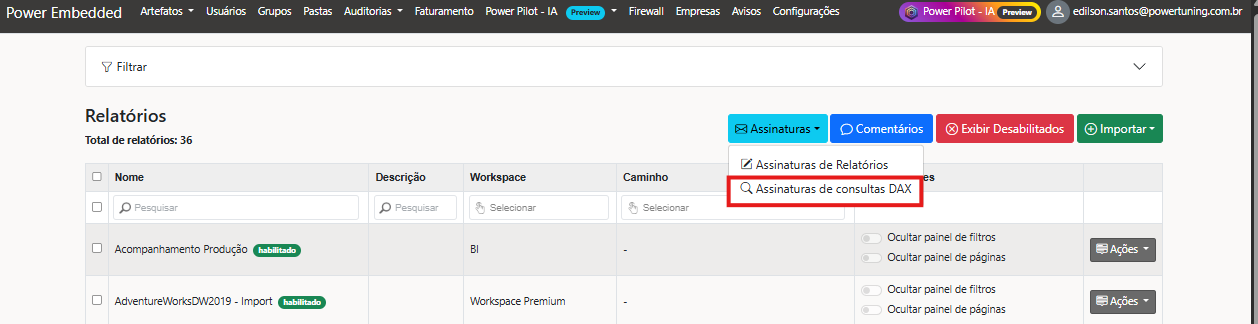 Assim como em outras telas do Power Embedded, o gerenciamento na assinatura de DAX foi pensado para ser simples e direto: