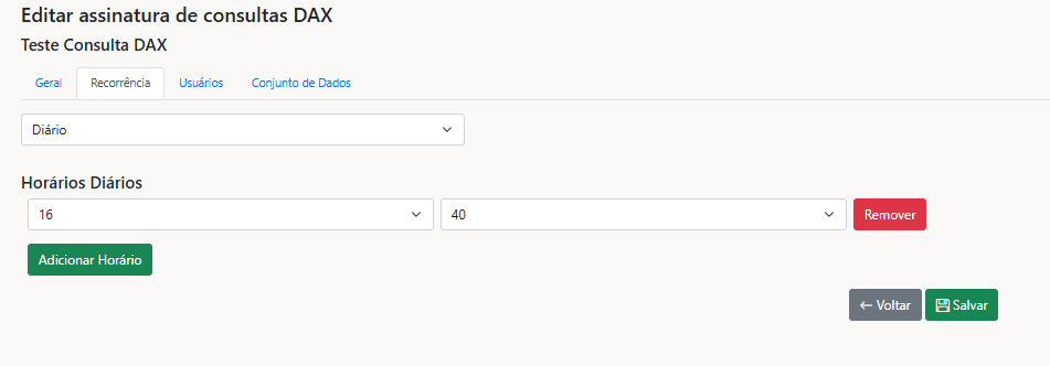 E não para por aí! Além de configurar suas consultas DAX, nossa funcionalidade permite adicionar um texto personalizado no corpo do e-mail que será enviado junto com os resultados das consultas. Isso torna a experiência ainda mais personalizada para os destinatários. Outra vantagem é a possibilidade de definir a recorrência do envio. Você pode configurar o envio de e-mails de forma automática, escolhendo o horário e a frequência que melhor atendem às suas necessidades, deixando o processo ainda mais eficiente e automatizado.
