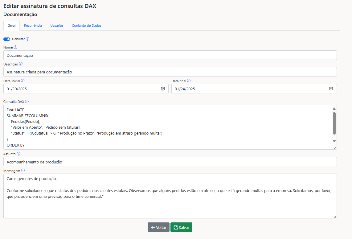 - No campo dedicado, insira a consulta DAX que deseja utilizar para os dados enviados por e-mail.