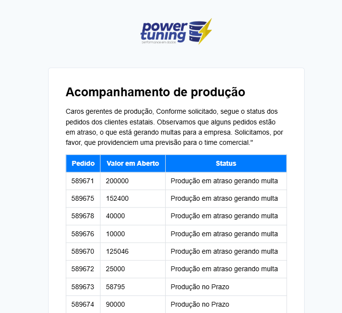 - Por exemplo, a consulta abaixo cria uma tabela listando os pedidos, o valor em aberto de cada um e seu status (definido como “Produção no Prazo” ou “Produção em atraso gerando multa” com base no campo CdStatus, ordenando os resultados por CdStatus.