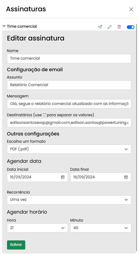 Ao fazer isso, será exibida uma tela semelhante à imagem abaixo, onde o usuário pode configurar a assinatura do relatório. Nesta tela, é possível definir os destinatários, escolher o formato do anexo e ajustar os parâmetros de data.