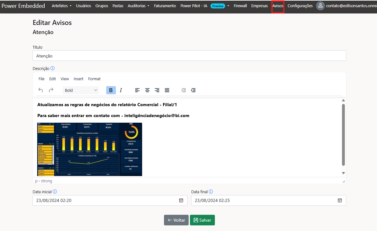 - Data e Hora Final: Defina a data e a hora em que o aviso deve deixar de ser exibido para os usuários. Após esse período, o aviso não será mais mostrado no portal de visualização.
