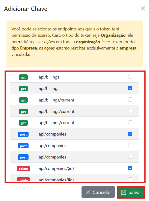 Por último clique no menu API Endpoints e selecione os endpoints de sua escolha, finalizando com o botão Salvar. A chave API ficará disponível no campo Chave.