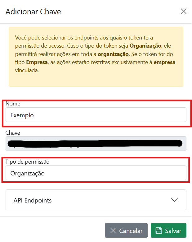 Clique em Adicionar Chave e dê um nome a seu token no campo Nome. Em seguida escolha o Tipo de permissão, sendo possível escolher entre Organização ou Empresa, dependendo do nível de permissão necessário.