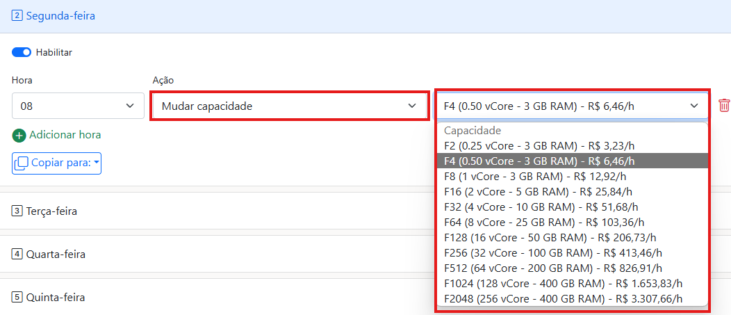 Anteriormente, era possível apenas ligar e desligar o recurso pelo portal. Agora, com a nova funcionalidade, é possível gerenciar o SKU da capacidade, ou seja, fazer upscale e downscale em horários específicos da semana ou até mesmo em dias específicos.