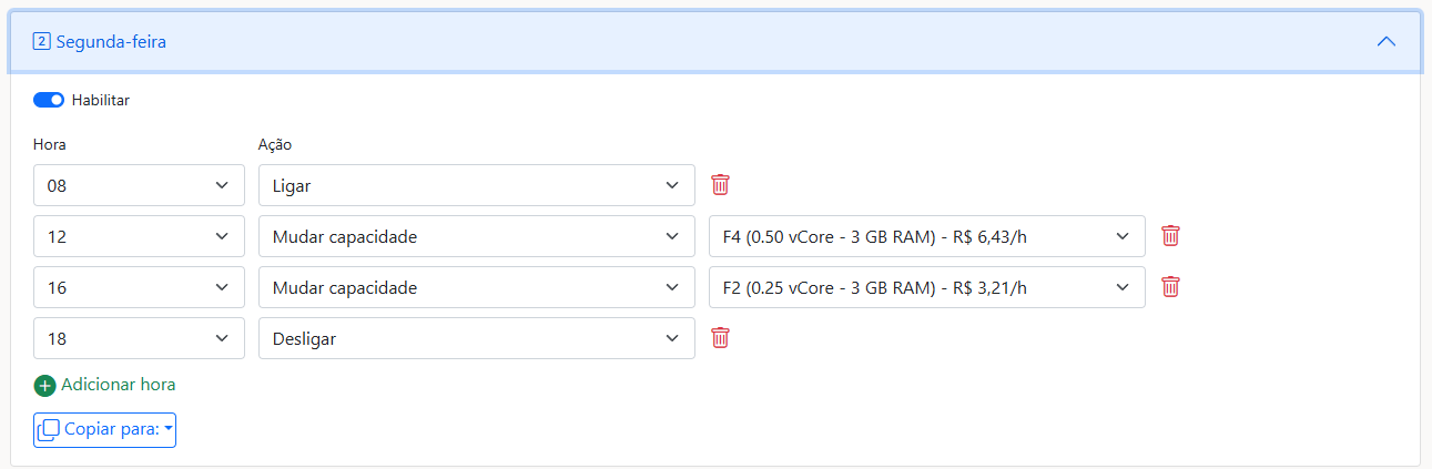 Após habilitar um dia da semana, você verá os campos Hora e Ação. O campo Hora define quando a ação será realizada, e o campo Ação permite escolher entre ligar, desligar ou mudar a capacidade. Anteriormente, as únicas opções disponíveis eram ligar e desligar, mas agora você também pode optar por mudar a capacidade, e é sobre isso que vamos detalhar.