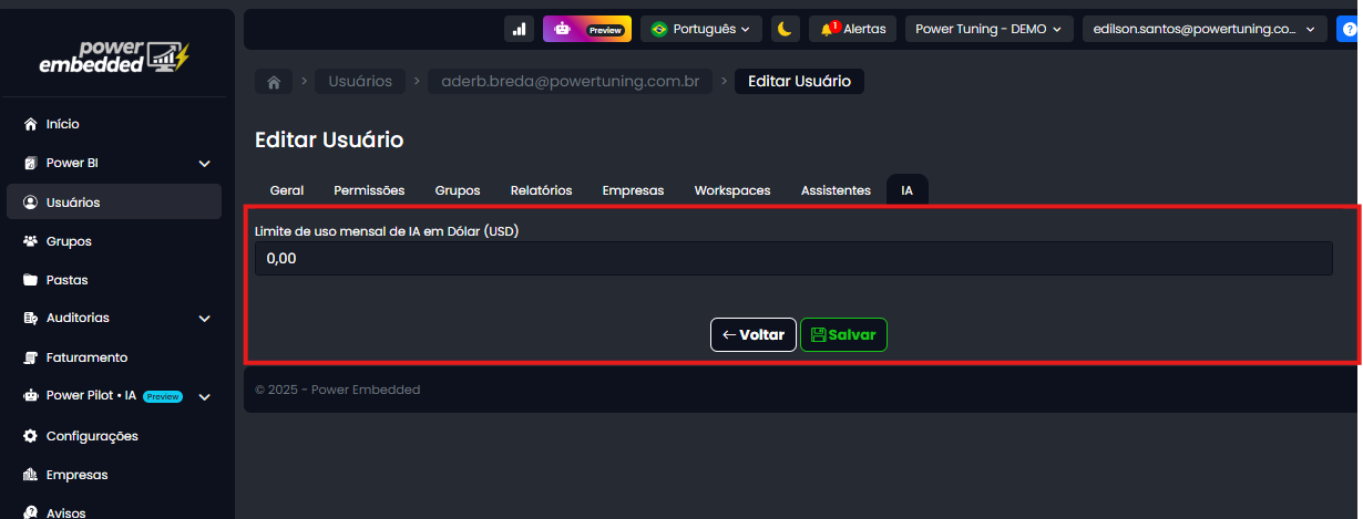 É importante destacar que o Power Embedded já conta atualmente com uma auditoria detalhada de uso do Power Pilot, permitindo que o cliente acompanhe o consumo por assistente, modelo utilizado e usuários. A nova funcionalidade de limite de uso por custo vem para complementar essa auditoria, oferecendo um nível adicional de controle e garantindo mais segurança no uso da IA.