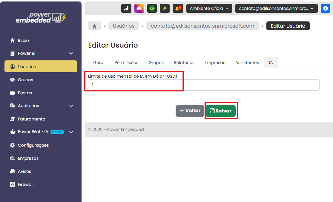 Nessa nova tela, informe o valor máximo permitido para consumo de IA no mês (ex: 1 USD).