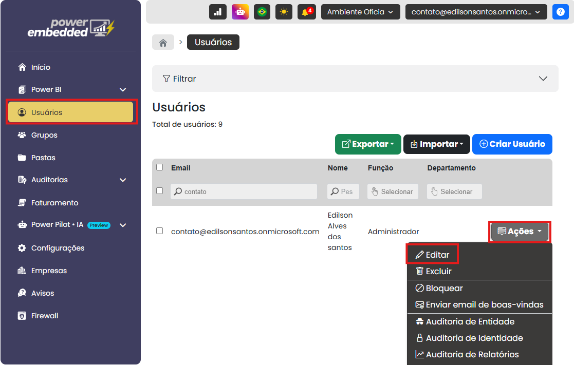 Vá até o menu de “Usuários” e clique em ações.