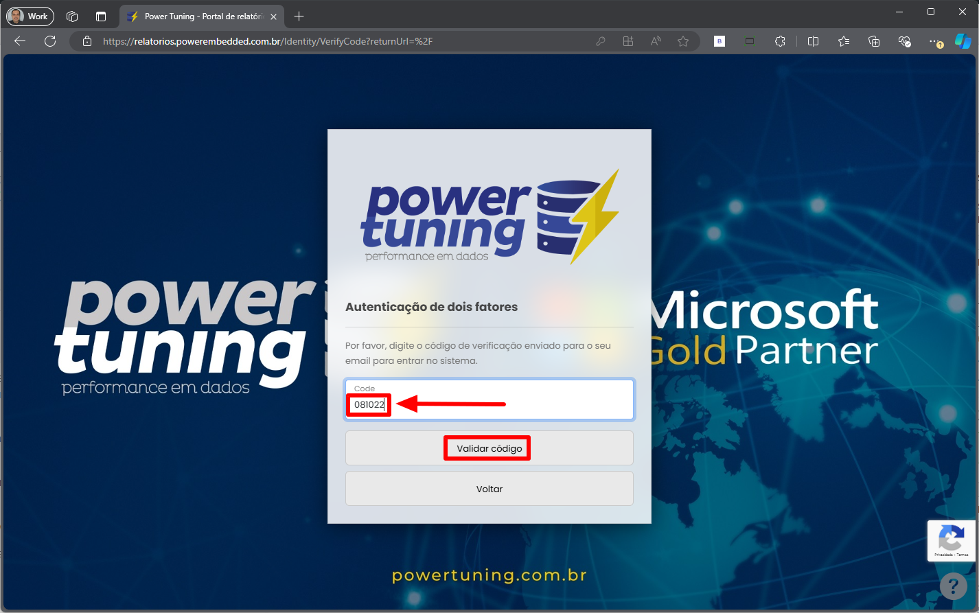 Após receber o email com o código de acesso, o usuário deverá inserir o código nesta tela e clicar no botão Validar código para continuar o processo de login.