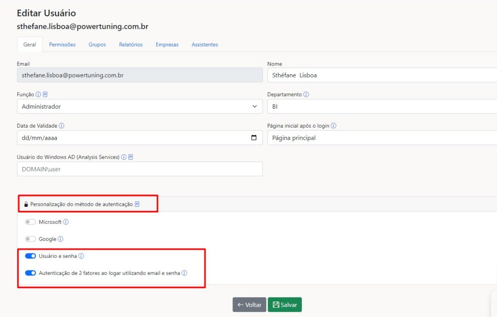 Ao ativar a autenticação de dois fatores, sempre que o usuário fizer login no portal de relatórios usando email e senha, será enviado um código de verificação para o seu e-mail.
