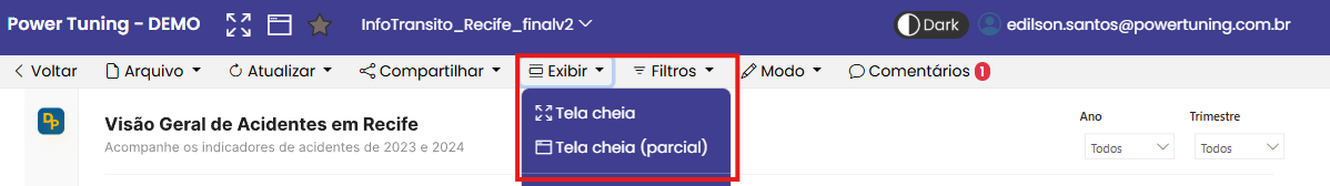 Pensando na diversidade de contextos em que os relatórios do Power Embedded são exibidos — seja em ambientes corporativos, reuniões ou até mesmo em TVs —, implementamos novas opções de visualização para oferecer mais flexibilidade na experiência do usuário.