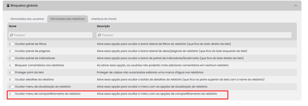 Acesse o portal de Administração Configurações > Parâmetros > Bloqueios Globais > aba Permissões dos relatorios > habilitar a flag “Ocultar menu de compartilhamento do relatório”.