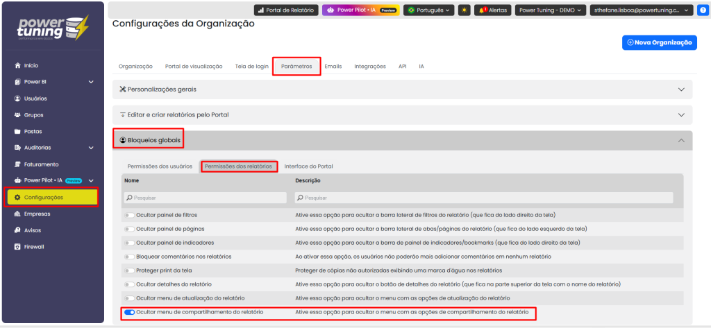Com o objetivo de oferecer uma gestão mais personalizada e prática, adicionamos uma nova permissão a nível global, que irá permitir ocultar o menu compartilhar no portal de visualização.