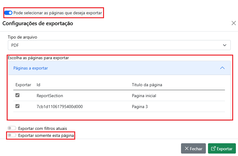 Pode selecionar as páginas que deseja exportar: Ao ativar esta opção, o usuário pode escolher manualmente quais páginas do relatório deseja exportar, oferecendo maior controle sobre o conteúdo exportado.