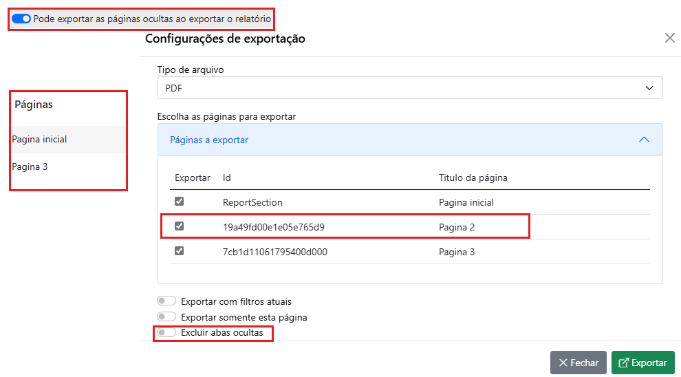 3.Pode exportar as páginas ocultas ao exportar o relatório: Permite exportar páginas que estão ocultas no relatório, mesmo que não sejam visíveis para o usuário. Esta opção também inclui a capacidade de excluir as páginas ocultas, facilitando o processo de exportação.