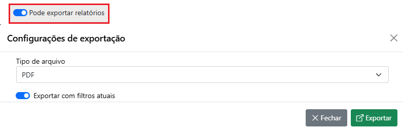 É importante notar que a permissão “Pode exportar relatórios” serve como uma permissão base, sem a qual as outras funcionalidades não serão ativadas.