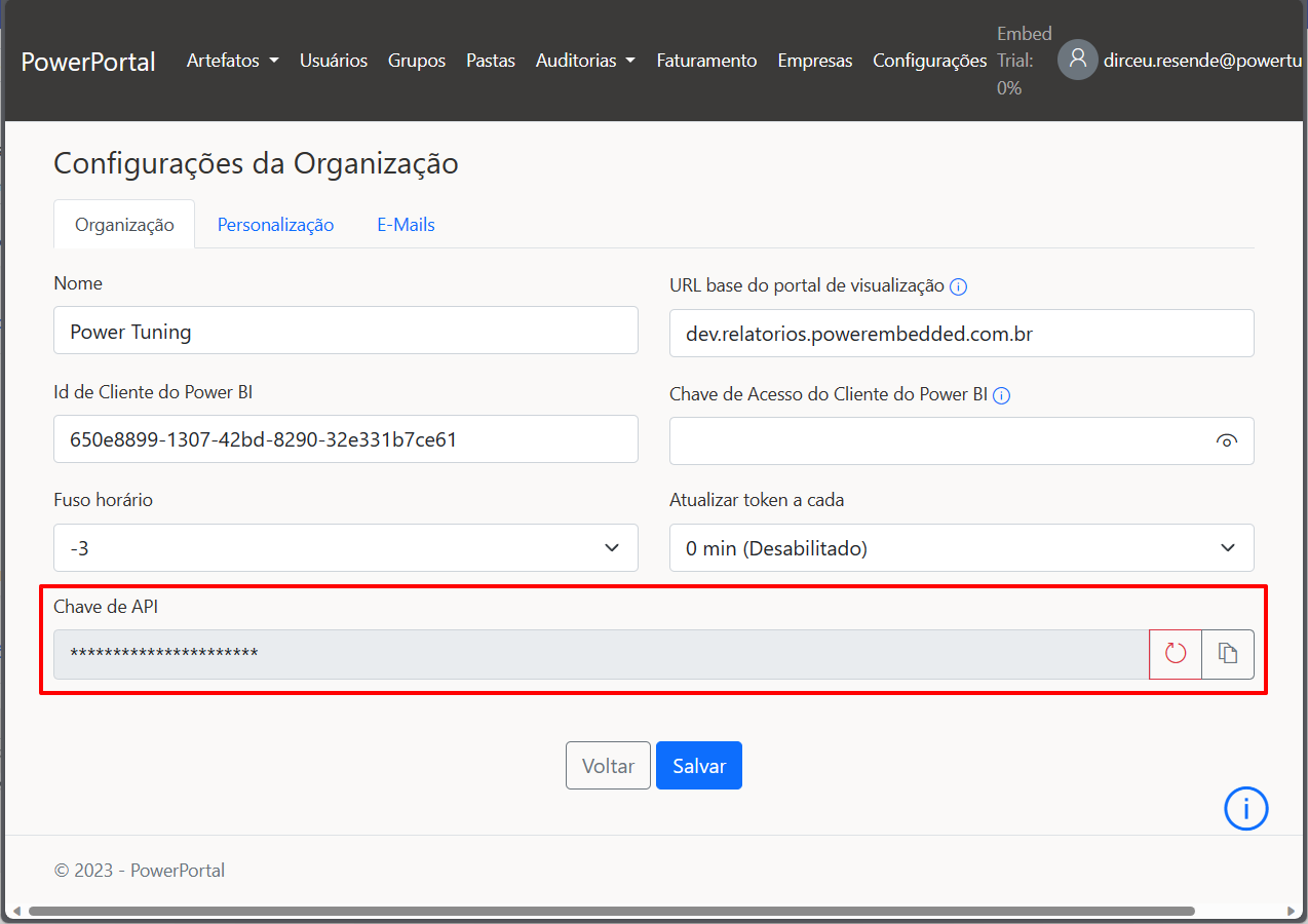 - O ID da organização (ID fixo para cliente do Power Embedded – Está na URL da tela de configurações – Ex: 12201800-1a46-491a-bfe3-6ee5590e372e)