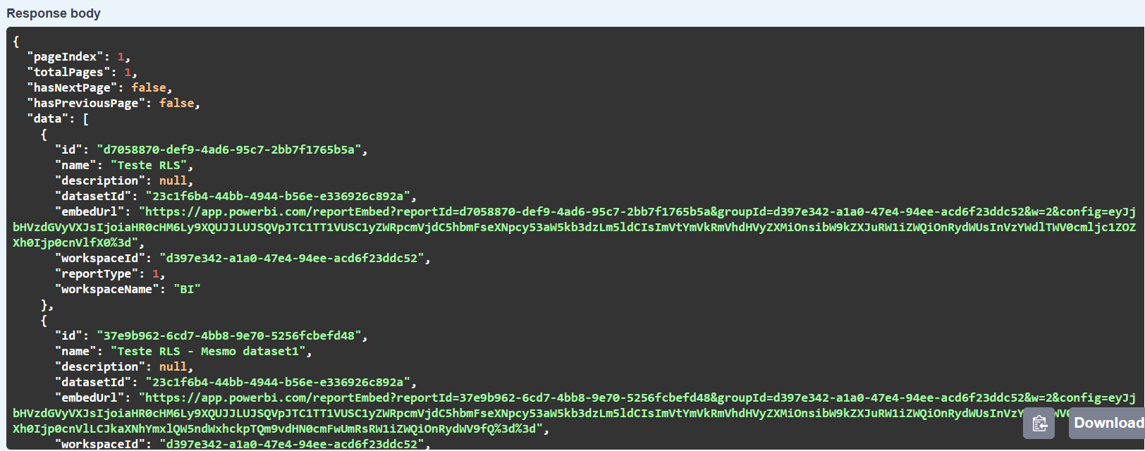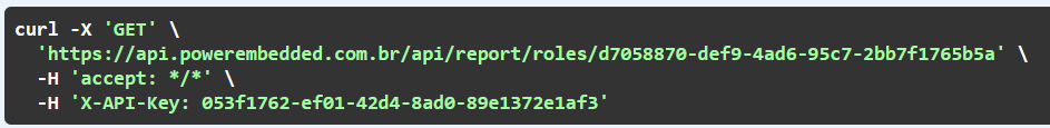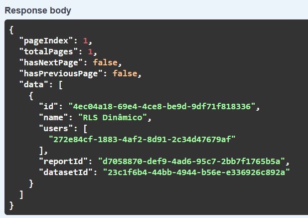 Você também pode listar o nome das roles que um relatório possui, para criar a associação Relatório X Usuário X Role (RLS), onde o parâmetro da chamada é o ID do relatório: