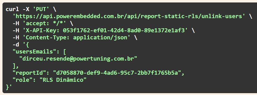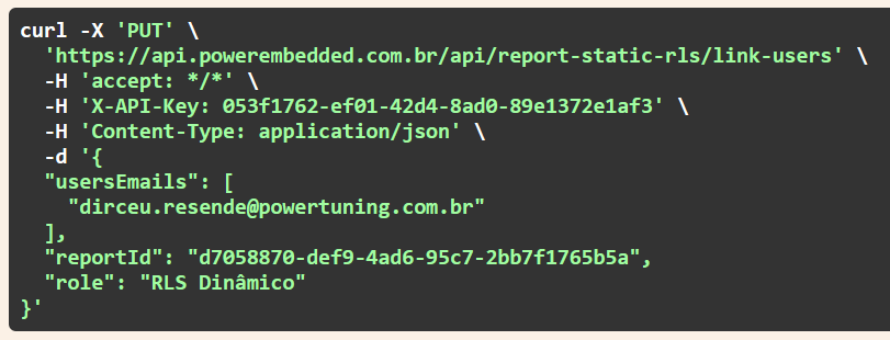 Para atribuir uma permissão de RLS, você irá passar uma lista de e-mails que vão ser adicionados na regra do RLS, o ID do relatório e o nome da role que os usuários serão adicionados.