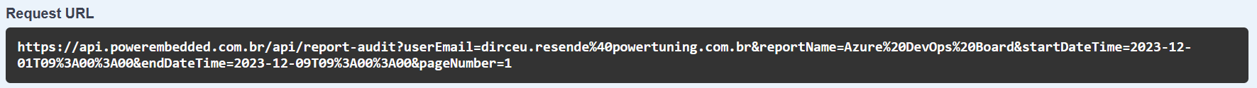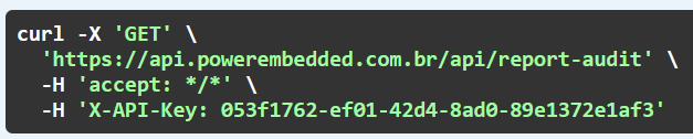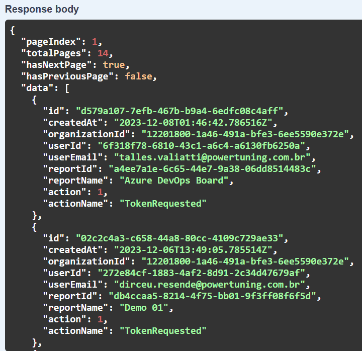 Você também pode utilizar a API para acessar o log de auditoria de relatórios e conseguir consultar todos os acessos a relatórios que foram realizados pelos usuários do Power Embedded.