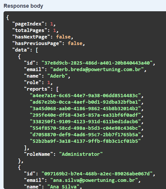 Para listar esse mapeamento entre Relatório x Usuário x Role, você pode utilizar a chamada abaixo, e poderá filtrar os dados pelo ID do usuário, Id do relatório ou nome da role: