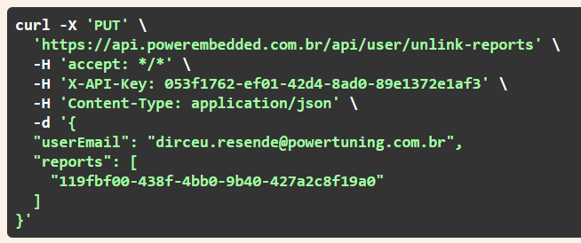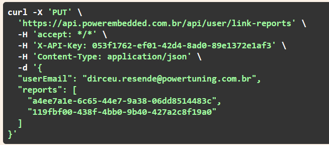 Você também pode dar permissão para um usuário acessar um determinado relatório, informando o e-mail do usuário e uma lista com os ID’s dos relatórios: