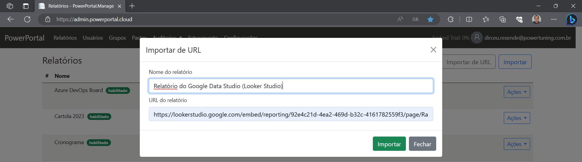 Neste exemplo, estarei importando um relatório que criei no Google Data Studio para o Power Embedded: