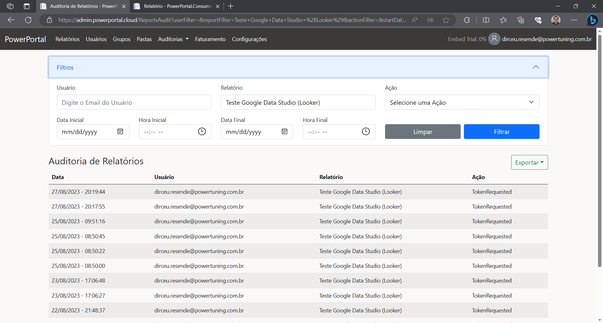 As auditorias de acesso de relatório são aplicadas normalmente para os relatórios externos, assim como já funcionam nos outros tipos de relatórios: