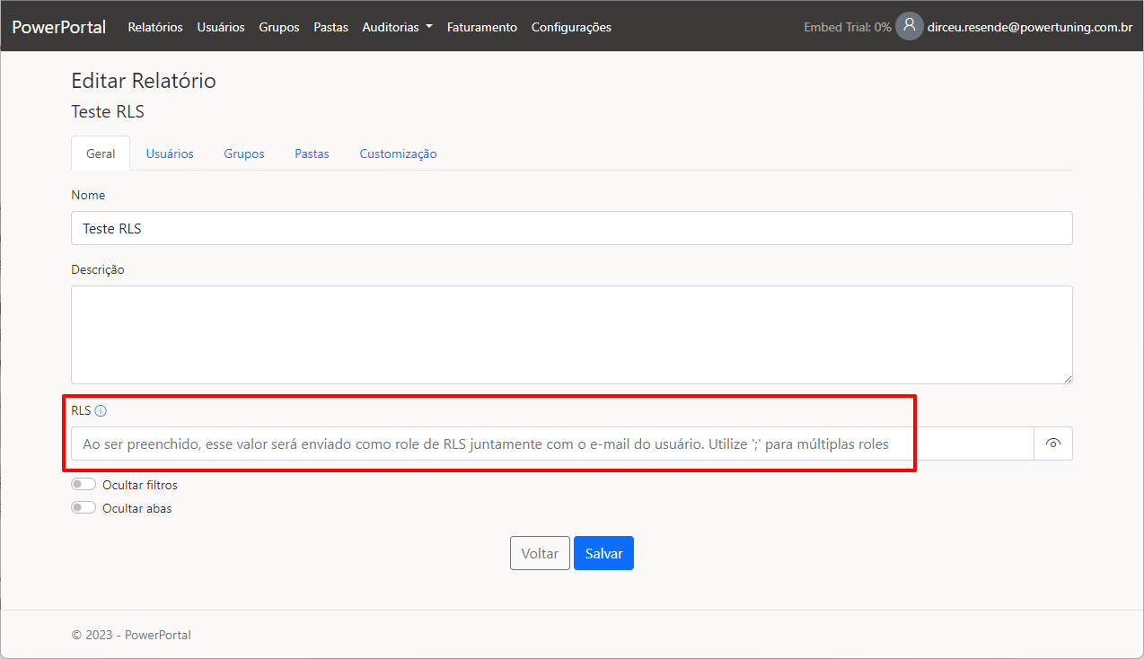 Agora basta salvar nessa tela para confirmar as alterações e ativar o RLS nesse relatório.