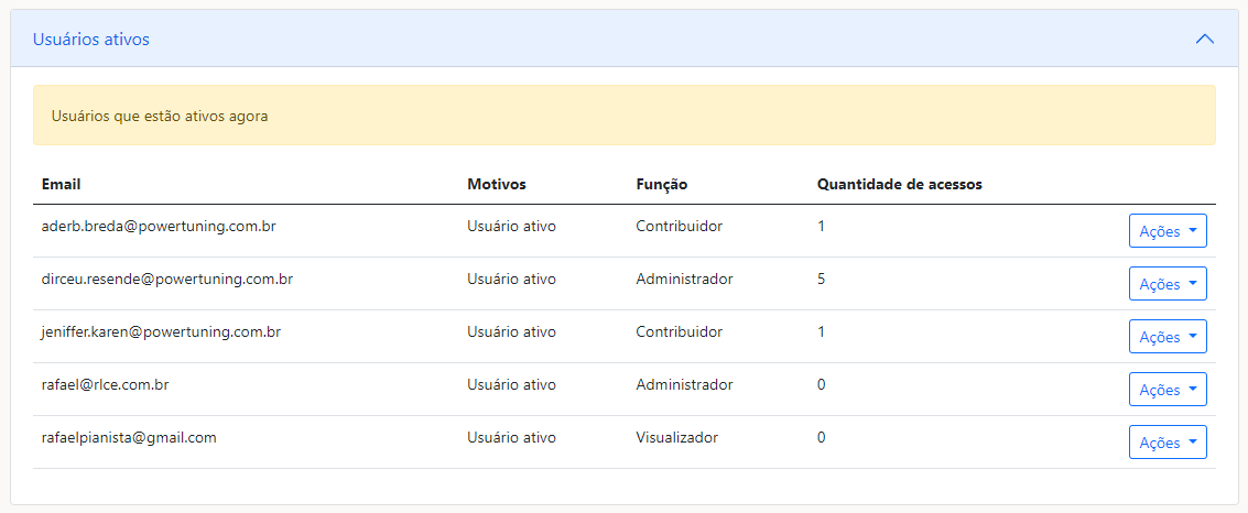 Clicando no botão de “Opções”, é possível visualizar abrir o histórico de logins e acessos desse usuário