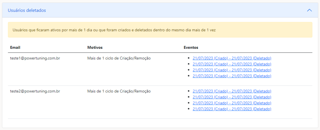 Clicando no link do evento, é possível visualizar mais detalhes sobre a criação e deleção desse usuário.