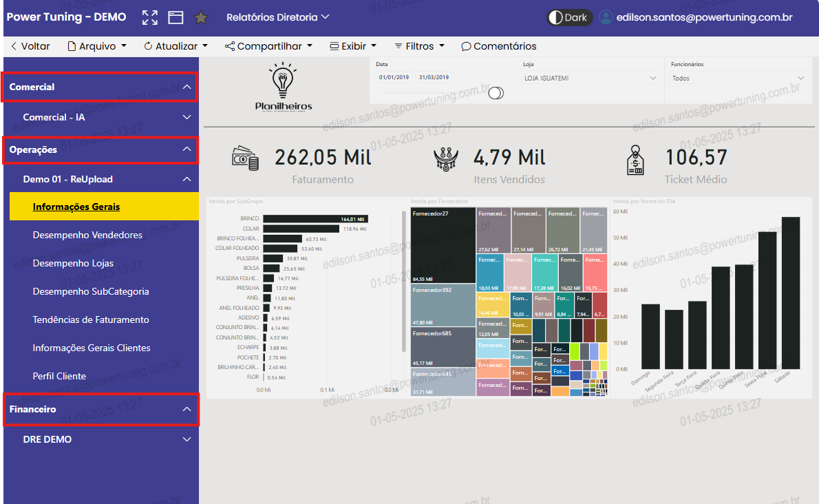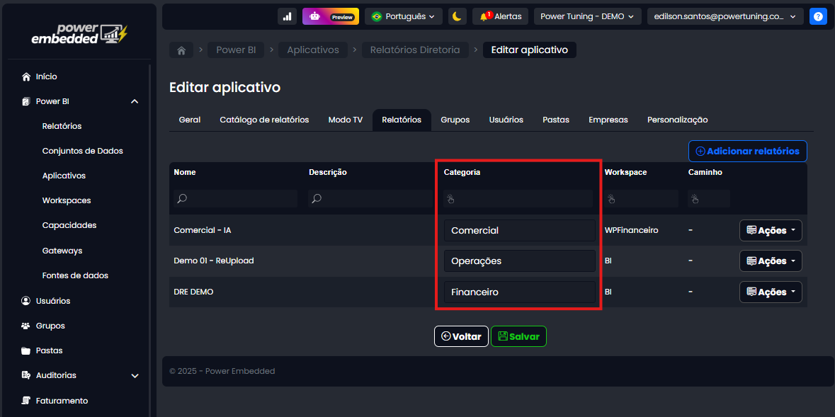 Com essa melhoria, é possível classificar os relatórios por temas, como Financeiro, Comercial, Operacional, entre outros — facilitando a organização, a busca e o consumo das informações por parte dos usuários finais.
