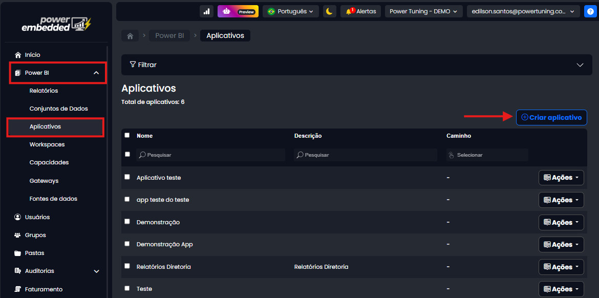 Acesse o portal de administração e vá até a aba Power BI e clique em Aplicativos, em seguida você pode ou clica em Criar Ou Ações para Editar