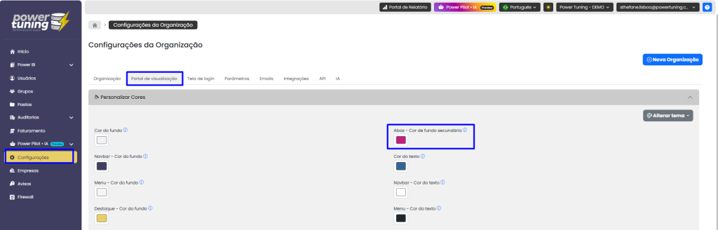 Com o objetivo de tornar o portal cada vez mais personalizável para nossos clientes, agora também é possível configurar a cor nas Abas no Portal de Visualização.